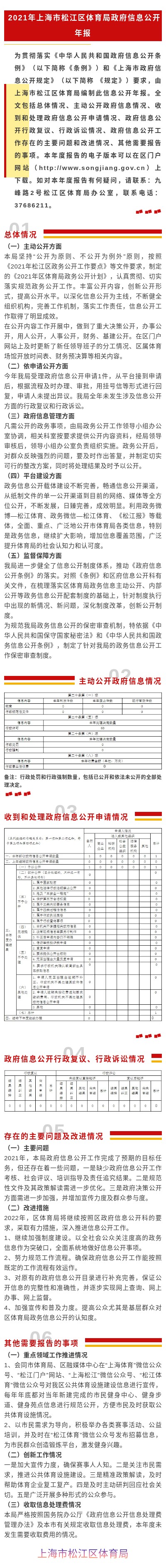 贯彻落实《中华人民共和国政府信息公开条例》(以下简称《条例》)和《上海市政府信息公开规定》(以下简称 《规定》)要求,由上海市松江区体育局编制此信息公开年报。全文包括总体情况、主动公开政府信息情况、收到和处理政府信息公开申请情况、政府信息公开行政复议、行政诉讼情况、政府信息公开工作存在的主要问题和改进情况、其他需要报告的事项。本年度报告的电子版本可以在区门户网站(http://www.songjiang.gov.cn)上下载。如对本年度报告有何疑问,请联系:九峰路2号松江区体育局办公室,联系电话:37686211。