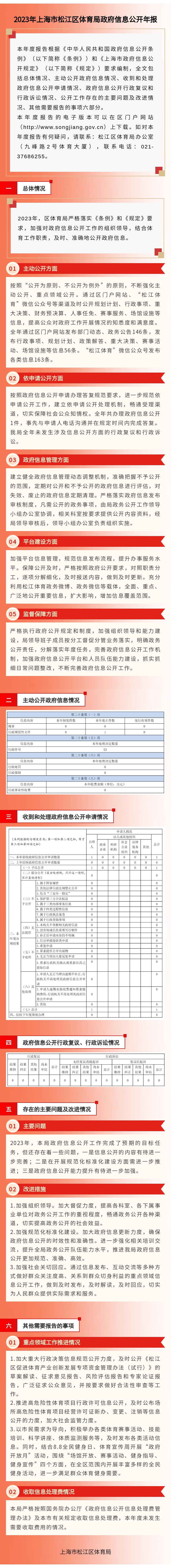 本年度报告根据《中华人民共和国政府信息公开条例》(以下简称《条例》)和《上海市政府信息公开规定》(以下简称《规定》)要求编制,全文包括总体情况、主动公开政府信息情况、收到和处理政府信息公开申请情况、政府信息公开行政复议和行政诉讼情况、公开工作存在的主要问题及改进情况、其他需要报告的事项六部分。本年度报告的电子版本可以在区门户网站(http://www.songjiang.gov.cn)上下载。如对本年度报告有何疑问,请联系:松江区体育局办公室(九峰路2号体育大厦),联系电话:021-37686255。
