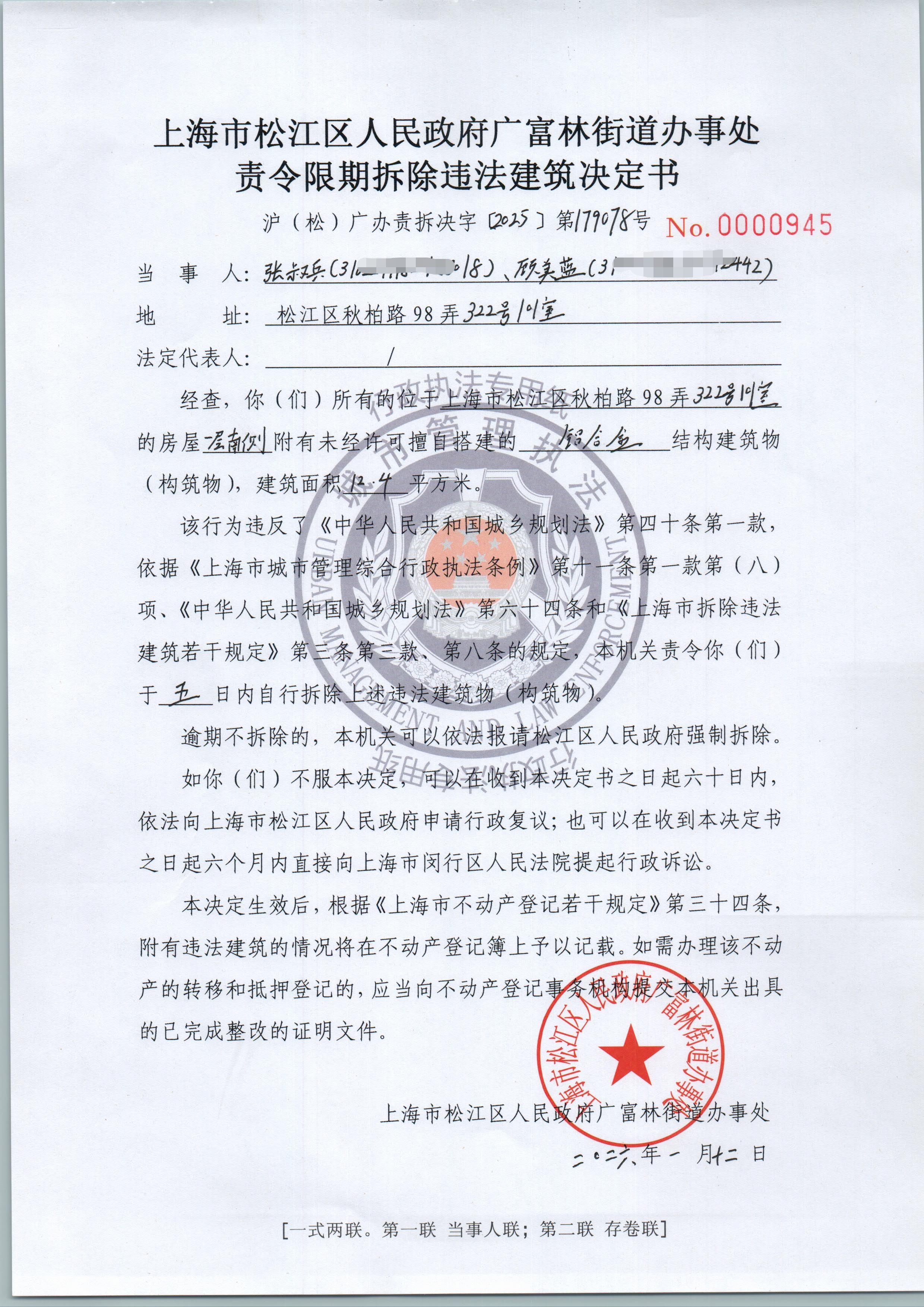 附件:《责令限期拆除违法建筑决定书》,文书编号:沪(松)广办责拆决字[2025]第179078号