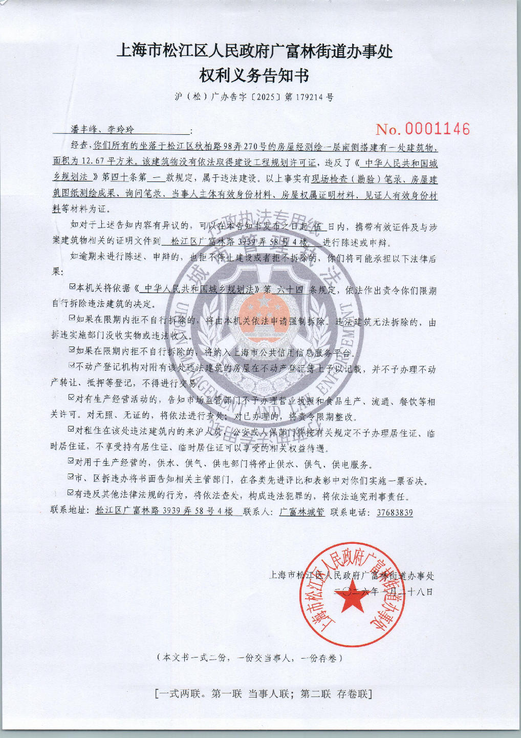 附件:《权利义务告知书》,文书编号:沪(松)广办告字[2025]第179214号