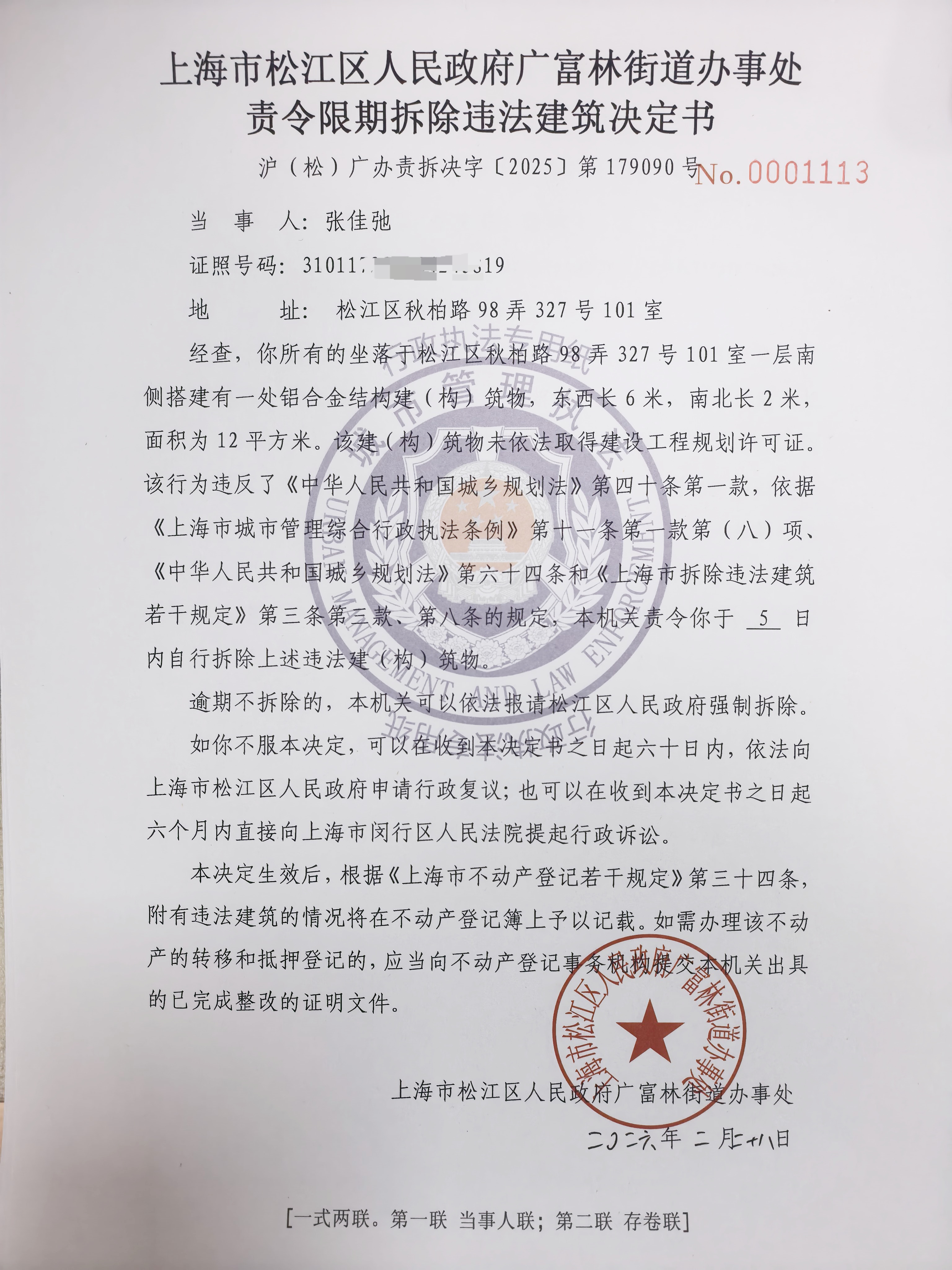 附件:《责令限期拆除违法建筑决定书》,文书编号:沪(松)广办责拆决字[2025]第179090号