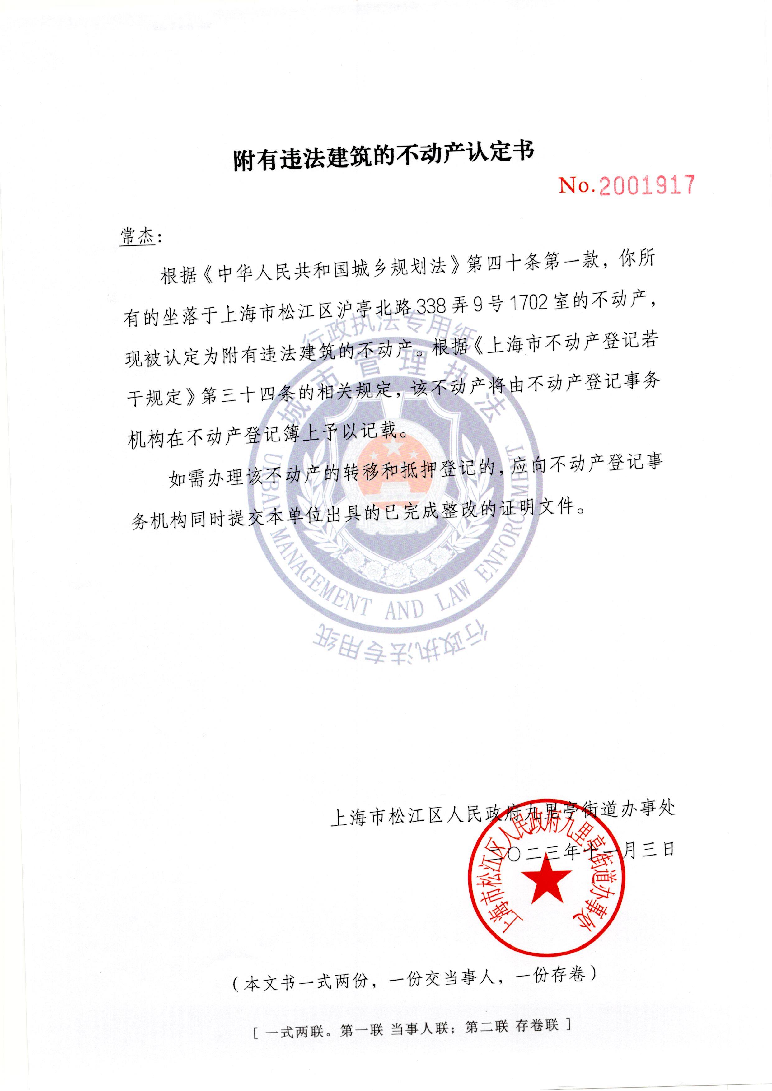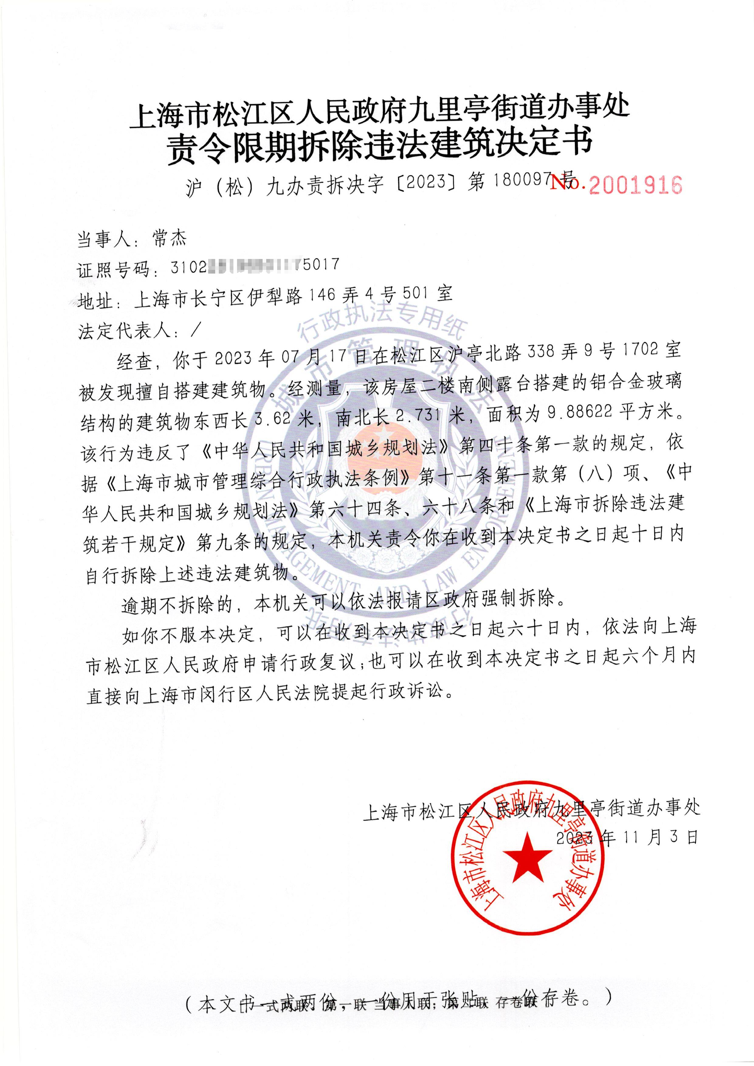 你在上海市松江区沪亭北路338弄9号1702室涉嫌擅自搭建建筑物,本机关多次联系你未果,因通过《中华人民共和国民事诉讼法》规定的其他方式无法送达,依照《中华人民共和国民事诉讼法》第九十五条的规定,向你公告送达《责令限期拆除违法建筑决定书》及《附有违法建筑的不动产认定书》,自发出本公告之日起,经过三十日,即视为送达。