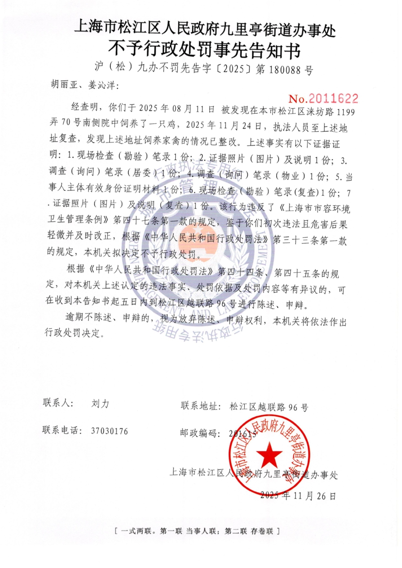 你方在上海市松江区涞坊路1199弄70号被发现在本市农村以外地区,饲养家禽的行为,本机关于2025年11月26日出具《不予行政处罚事先告知书》(沪(松)九办不罚先告字〔2025〕第180088号),因通过《中华人民共和国民事诉讼法》规定的其他方式无法送达,依照《中华人民共和国民事诉讼法》第九十五条的规定,向你方公告送达《不予行政处罚事先告知书》(沪(松)九办不罚先告字〔2025〕第180088号),自发出本公告之日起,经过三十日,即视为送达。