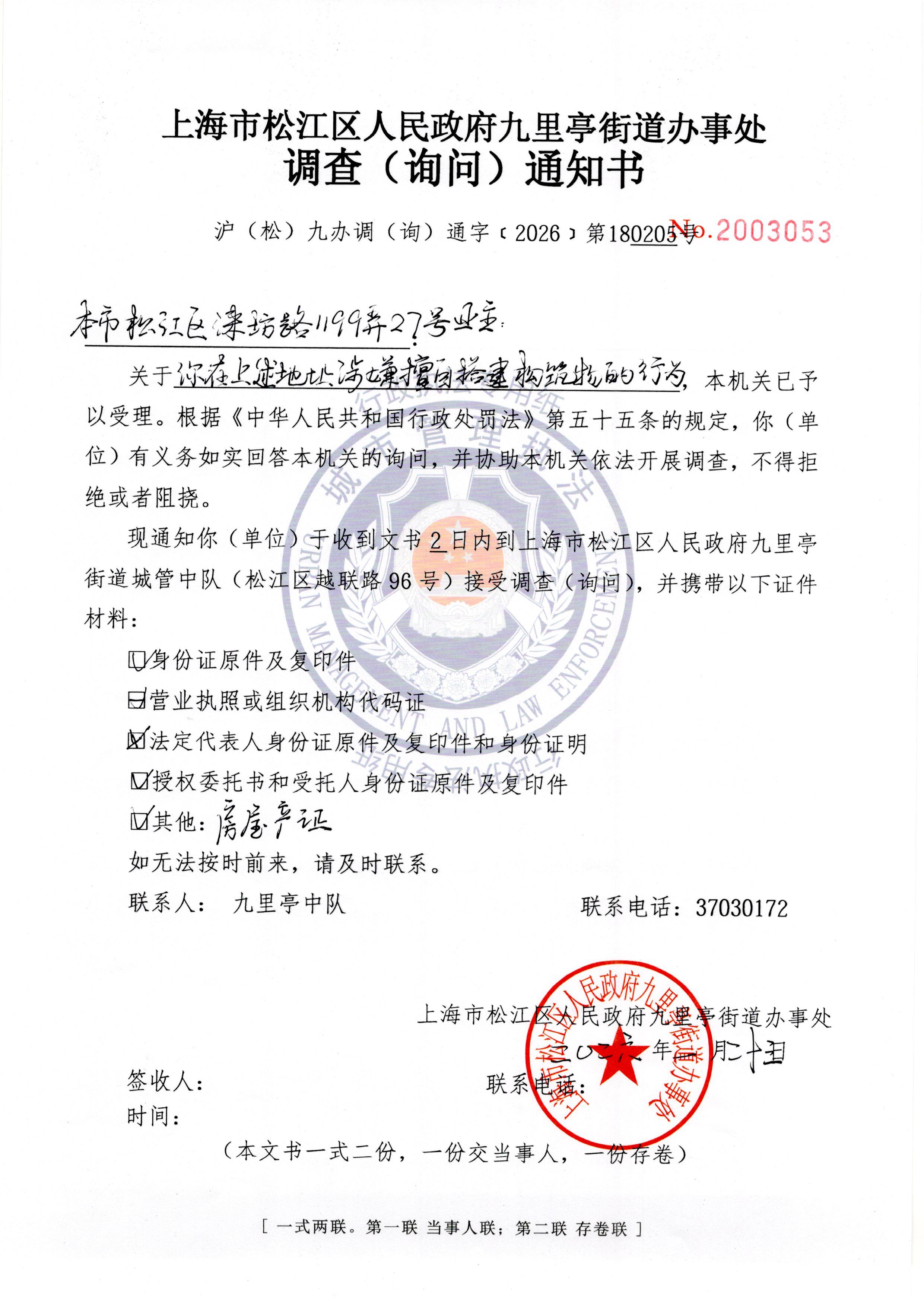 你方在上海市松江区涞坊路1199弄27号的房屋被发现存在擅自搭建构筑物的行为,本机关于2026年1月23日出具《调查(询问)通知书》(沪(松)九办调(询)通字〔2026〕第180205号),因通过《中华人民共和国民事诉讼法》规定的其他方式无法送达,依照《中华人民共和国民事诉讼法》第九十五条的规定,向你方公告送达《调查(询问)通知书》(沪(松)九办调(询)通字〔2026〕第180205号),自发出本公告之日起,经过三十日,即视为送达。