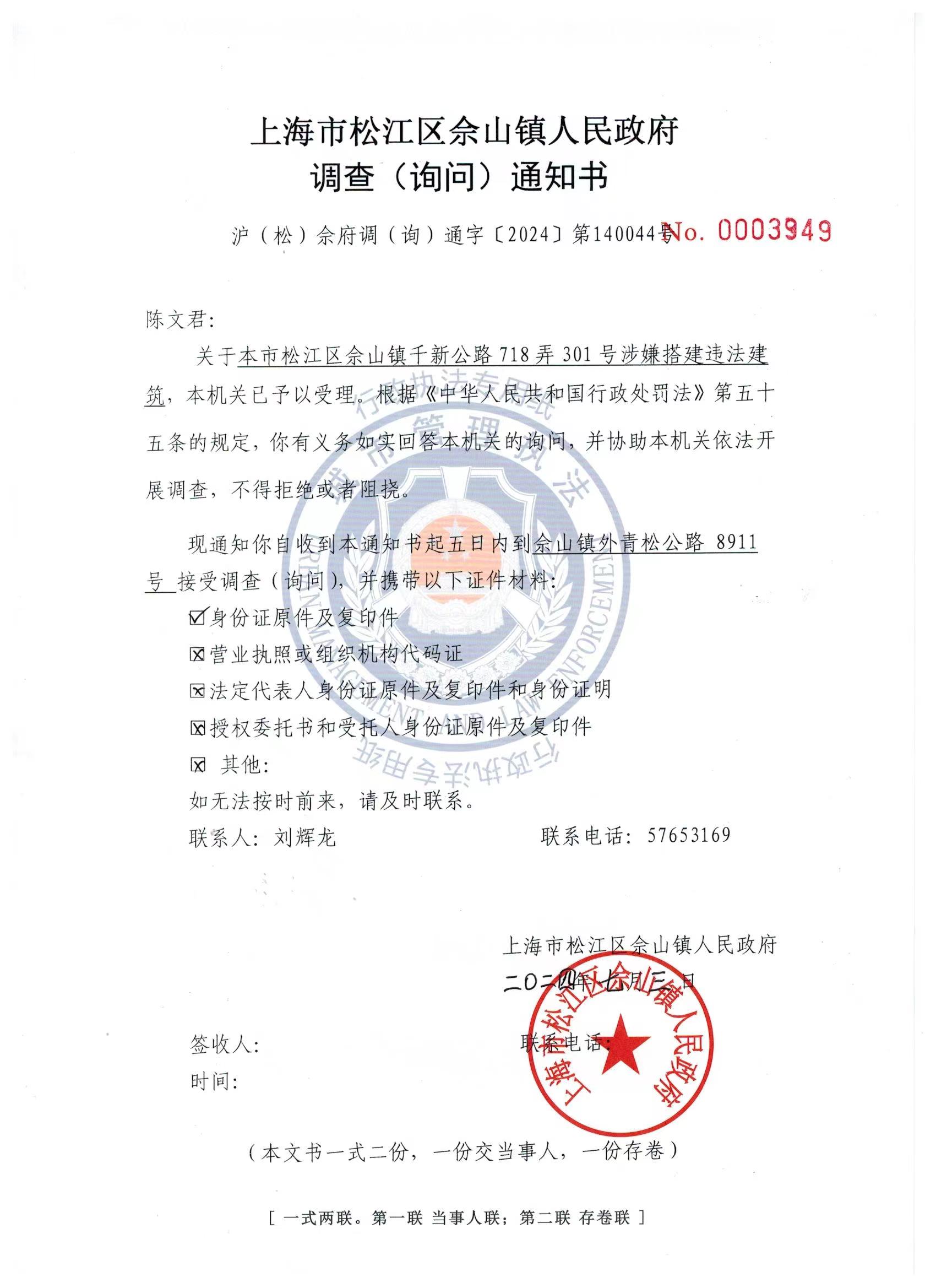 附件:《调查(询问)通知书》(文书编号:沪(松)佘府调(询)通字[2024]第140044号)
