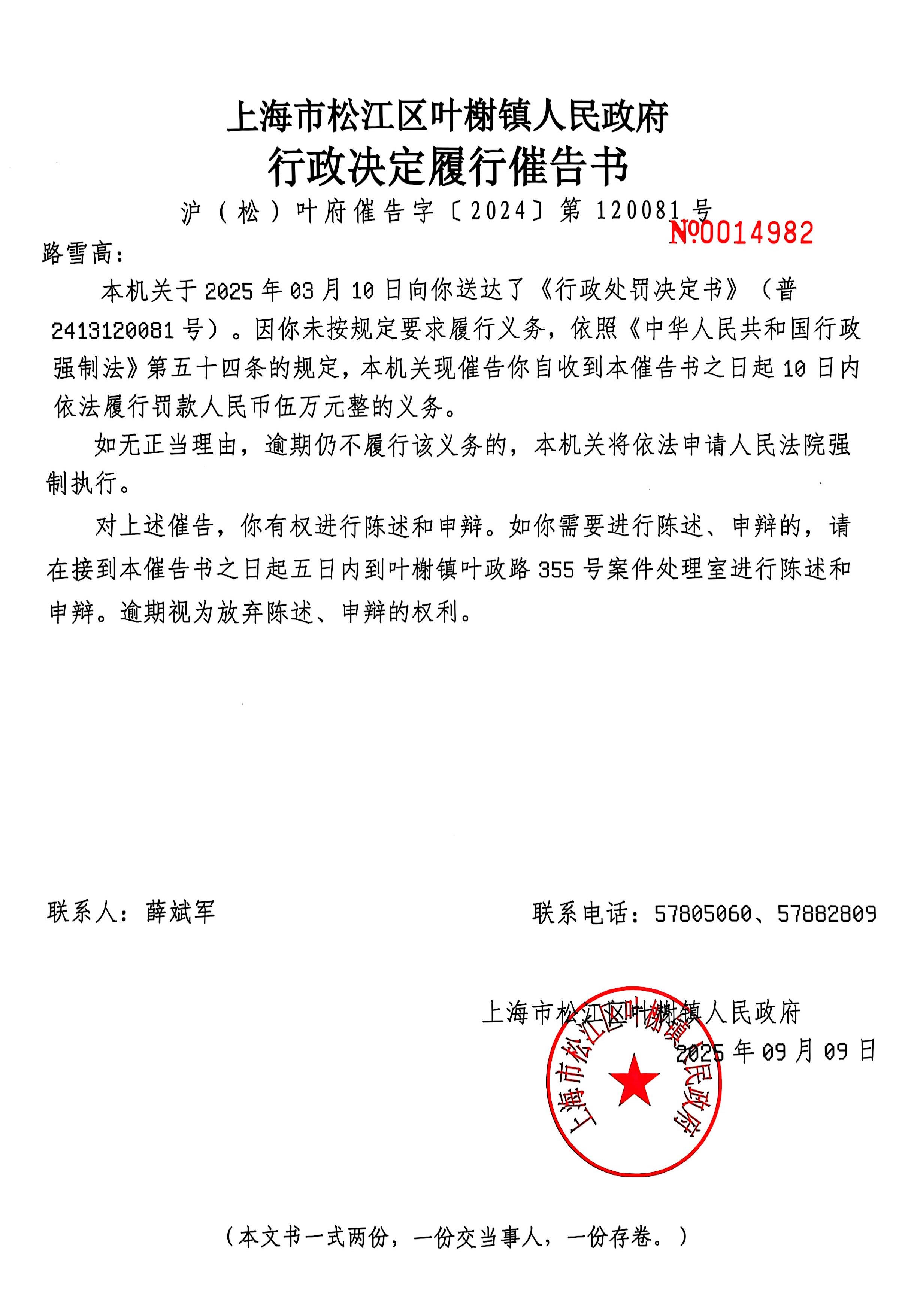 上海市松江区叶榭镇人民政府行政决定催告书