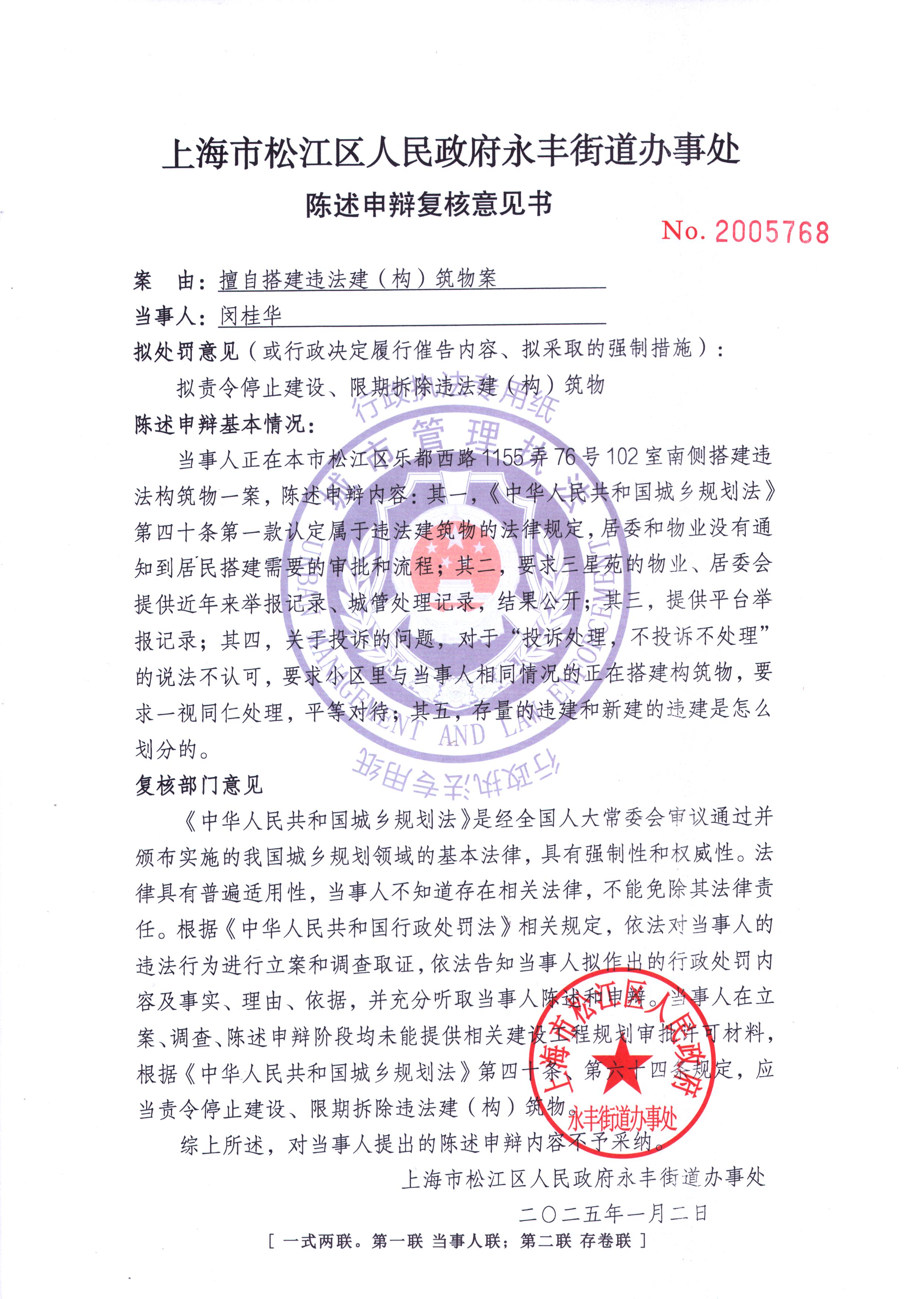 你涉嫌在上海市松江区乐都西路1155弄76号102室南侧搭建铝合金材质建(构)筑物一案,本机关多次联系你未果。因通过《中华人民共和国民事诉讼法》规定的其他方式无法确认有效送达,依照《中华人民共和国民事诉讼法》第九十五条的规定,向你们公告送达《陈述申辩复核意见书》,自发出本公告之日起,经过三十日,即视为送达。