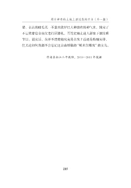 那片神奇的土地上洒过我的汗水(外一篇) 梁、长长的睫毛无一不显出欧罗巴人种独有的神气来,跳完了 不忘笑着给全场父老行屈膝礼,再笃定地走进人群坐下继续看 节目。说实话,我并不清楚她究竟是自发上前还是特地安排, 但无论如何我都不会忘记这自由骄傲的“帕米尔雄鹰”的女儿。 作者系松江二中教师,2010—2011 年援疆 215