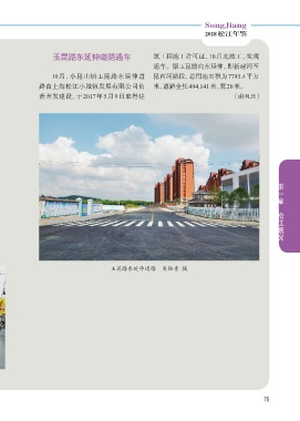 SongJiang 2018 松江年鉴 玉昆路东延伸道路通车 筑工程施工许可证,10月底竣工,实现 通车。原玉昆路向东延伸,即新建河至 10月,小昆山镇玉昆路东延伸道 昆西河路段,总用地面积为7745.4平方 路由上海松江小城镇发展有限公司负 米,道路全长494.141米,宽20米。 责开发建设,于2017年5月9日取得建 (谢双珏) 第一章 松江概况 玉昆路东延伸道路 吴怡青 摄 75