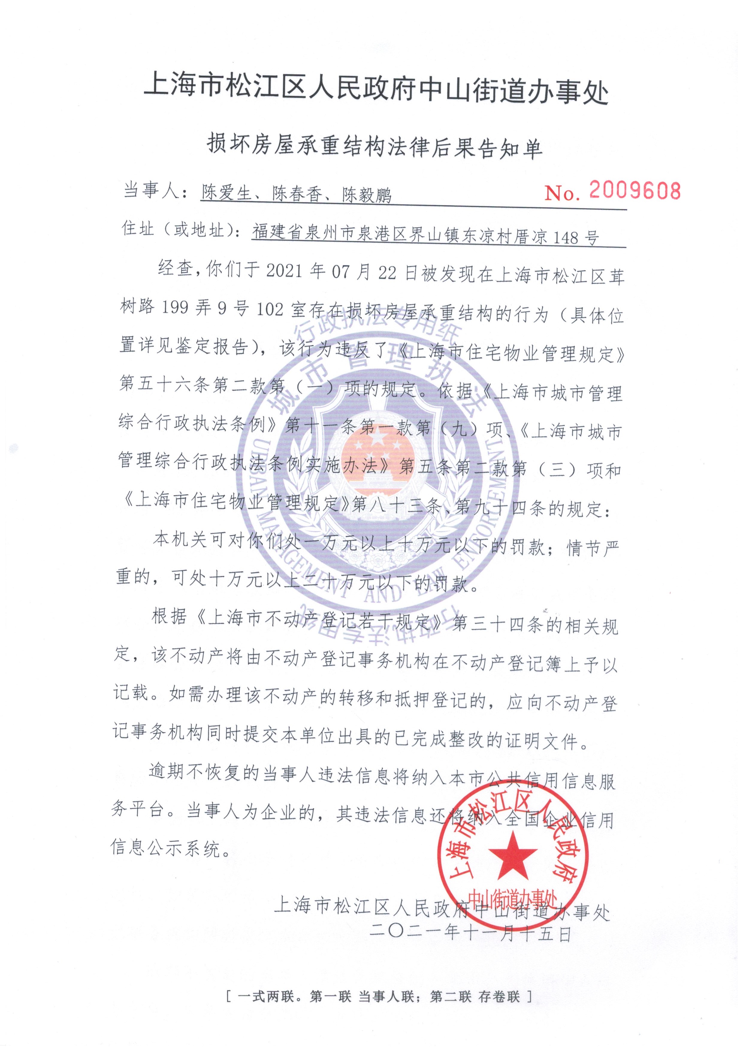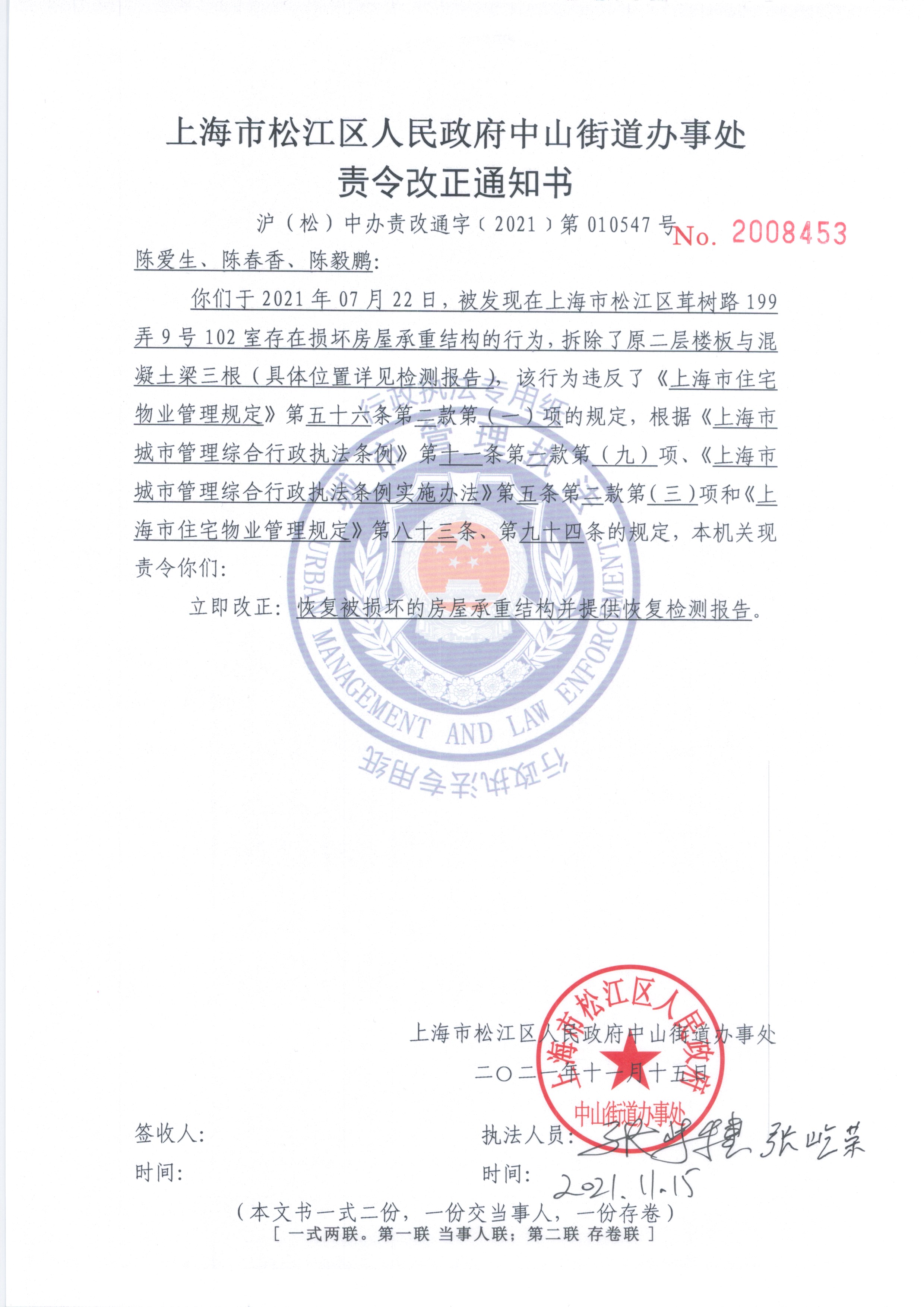 附后文件:《责令改正通知书》、《损坏房屋承重结构法律后果告知单》、《房屋质量检测报告》、《房屋承重结构修复施工企业名单告知单》、《上海市房屋质量检测推荐单位通知单》