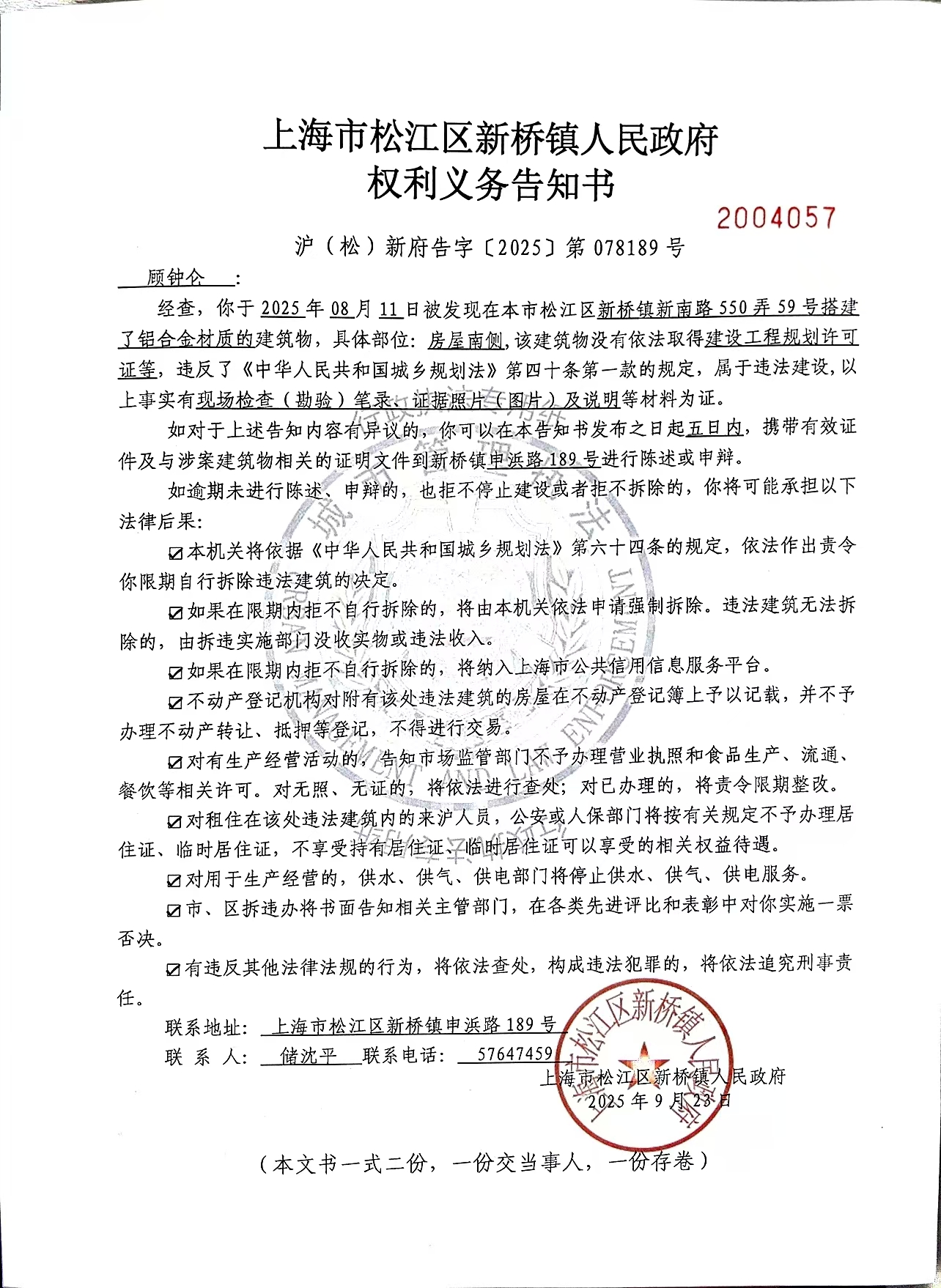 附:《权利义务告知书》(沪(松)新府告字〔2025〕第078189号)