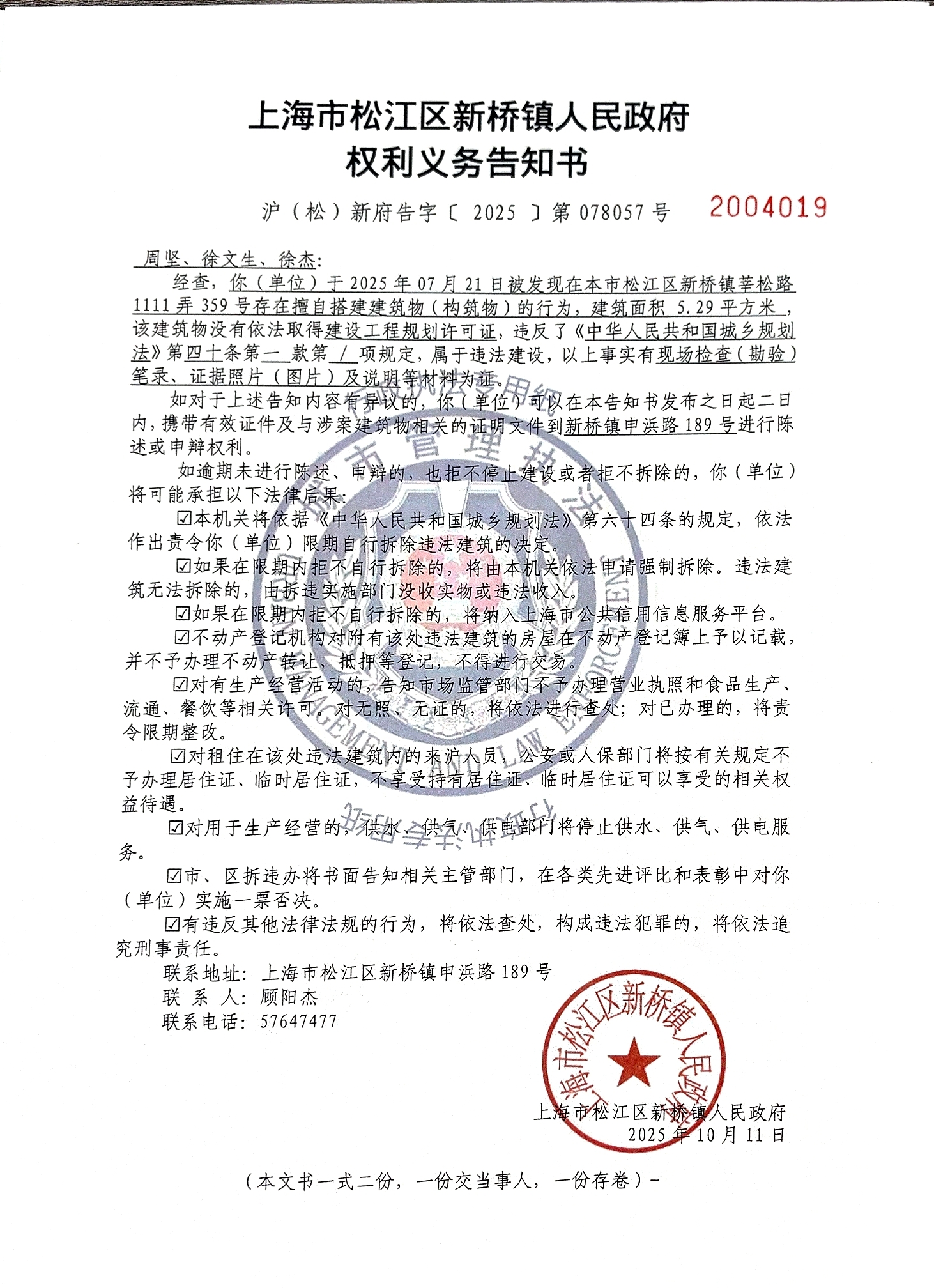 附:《权利义务告知书》(沪(松)新府告字〔2025〕第078057号)