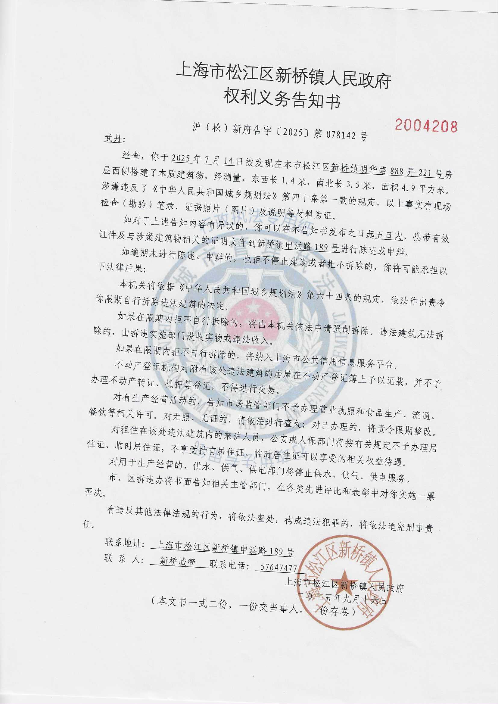 你在上海市松江区新桥镇明华路888弄221号存在擅自搭建建筑物的情况。因通过《中华人民共和国民事诉讼法》规定的其他方式无法有效送达,依照《中华人民共和国民事诉讼法》第九十五条的规定,现向你公告送达《权利义务告知书》(沪(松)新府告字〔2025〕第078142号)。自发出本公告之日起经过三十日,即视为送达。