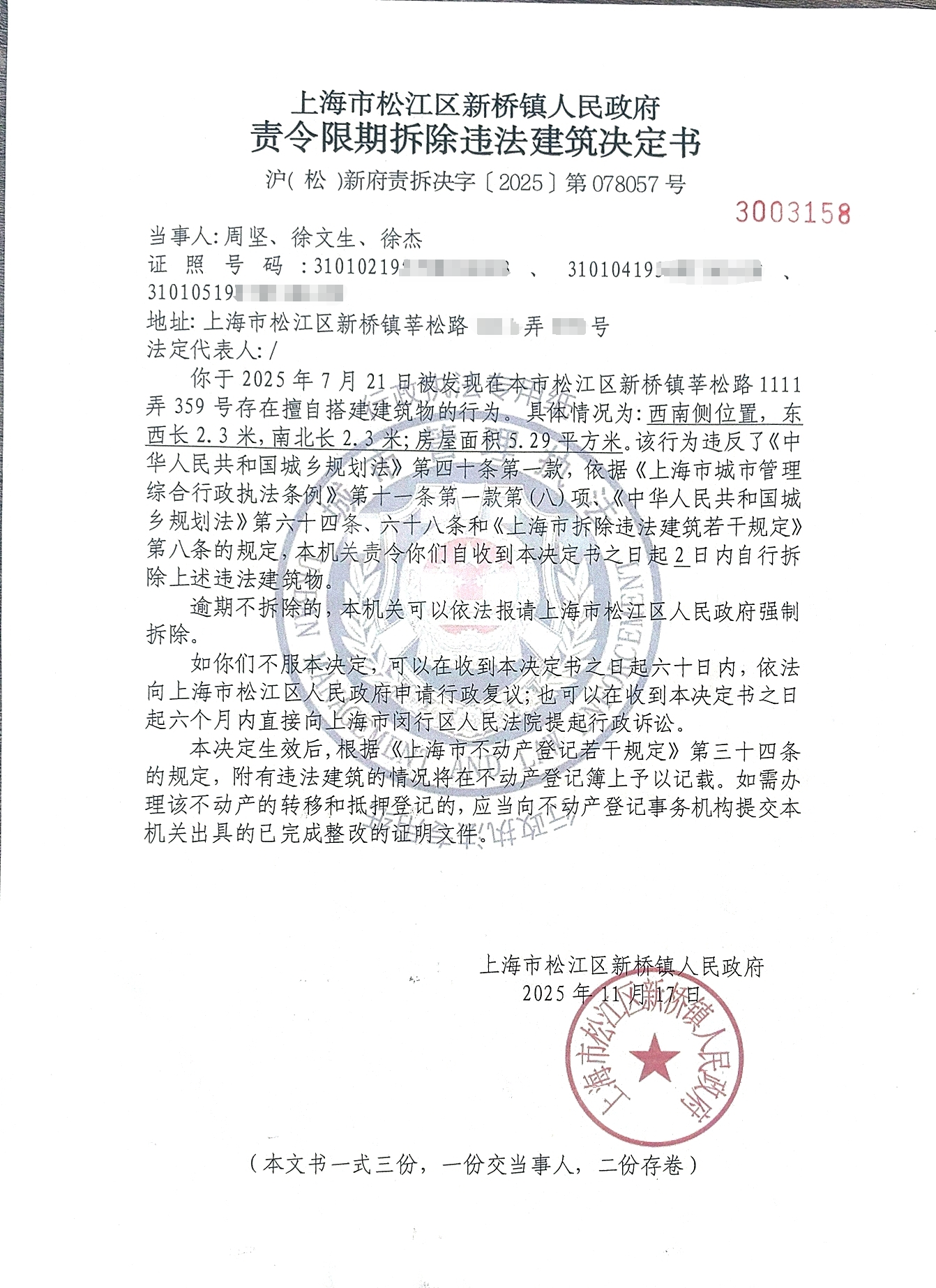 附:《责令限期拆除违法建筑决定书》(沪( 松 )新府责拆决字〔2025〕第078057号)