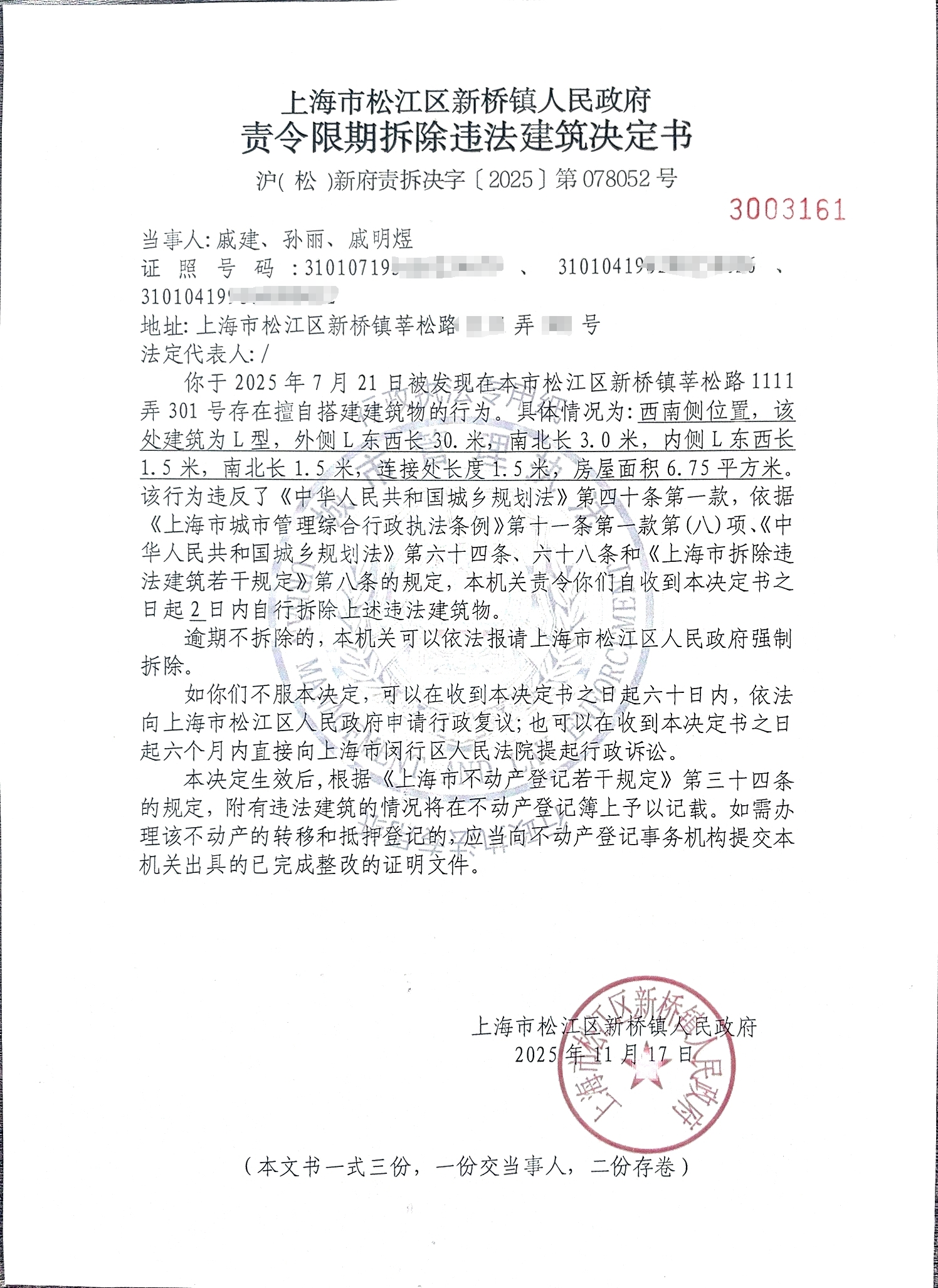 附:《责令限期拆除违法建筑决定书》(沪( 松 )新府责拆决字〔2025〕第078052号)
