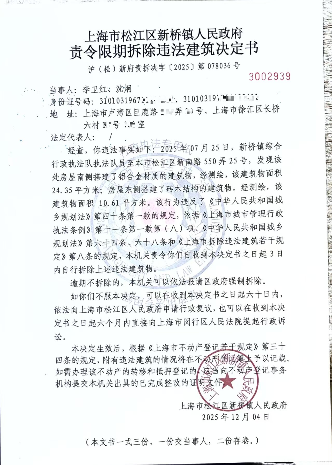 附:《责令限期拆除违法建筑决定书》(沪(松)新府责拆决字〔2025〕第078036号)