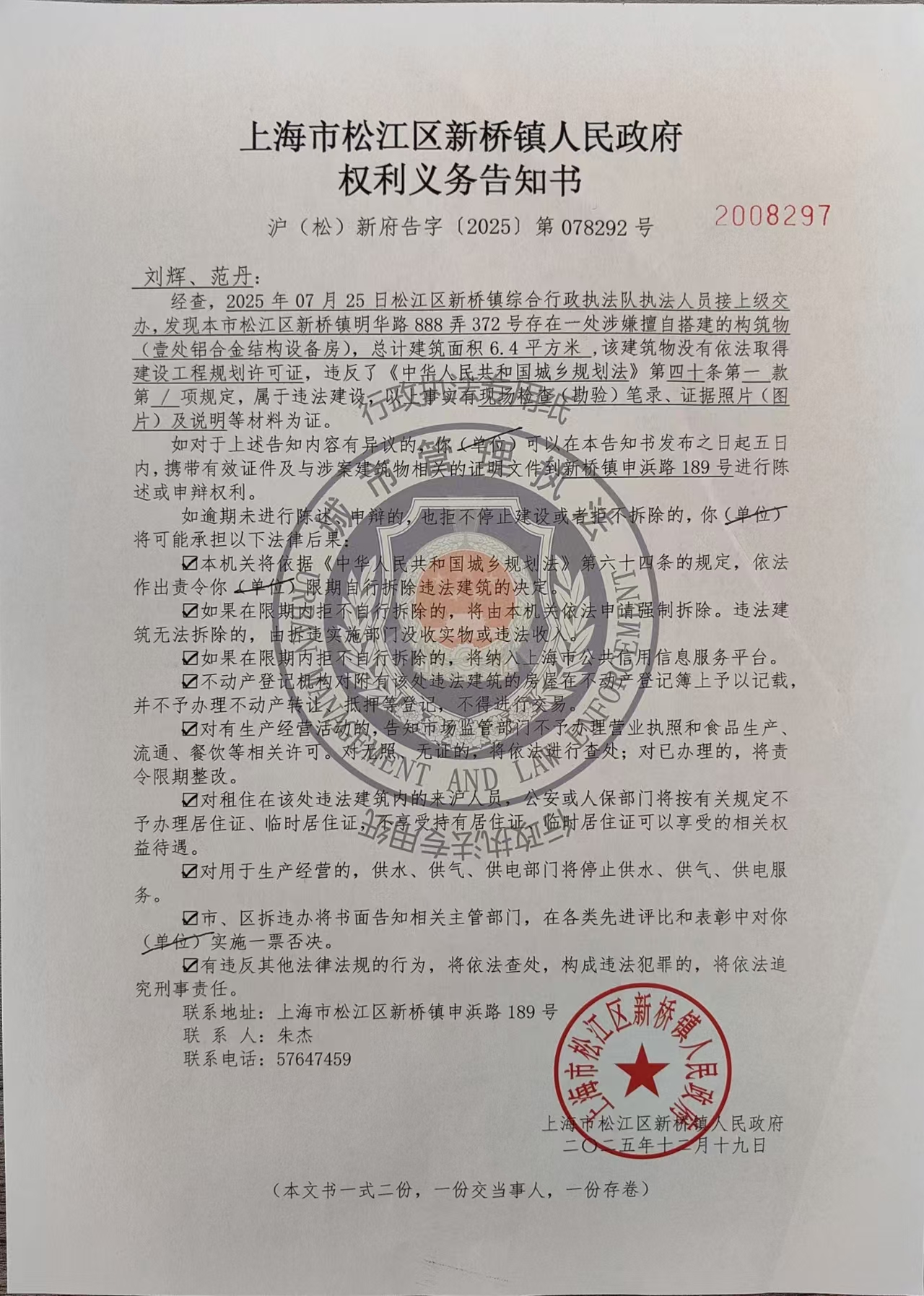 附:《权利义务告知书》(沪(松)新府告字〔2025〕第078292号)。