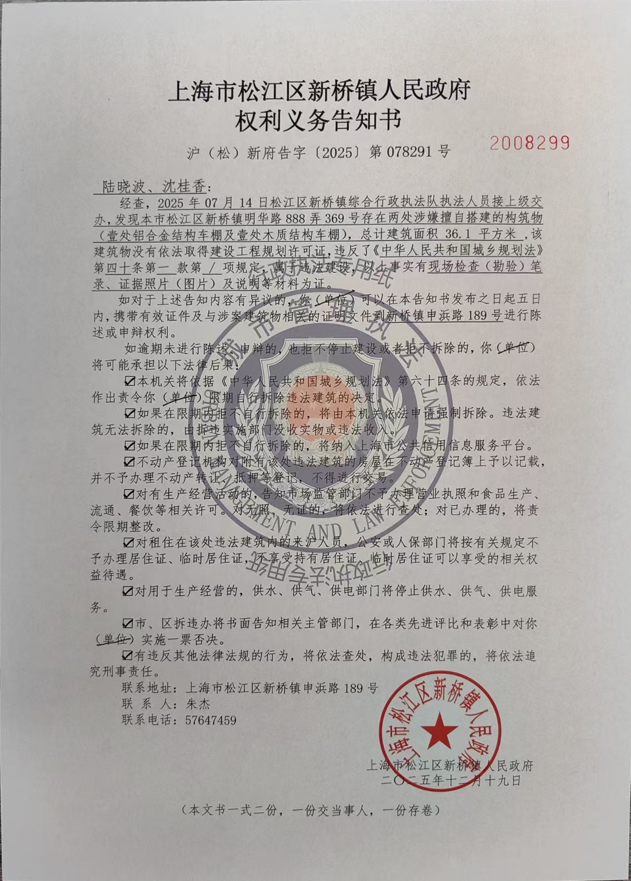 附:《权利义务告知书》(沪(松)新府告字〔2025〕第078291号)。
