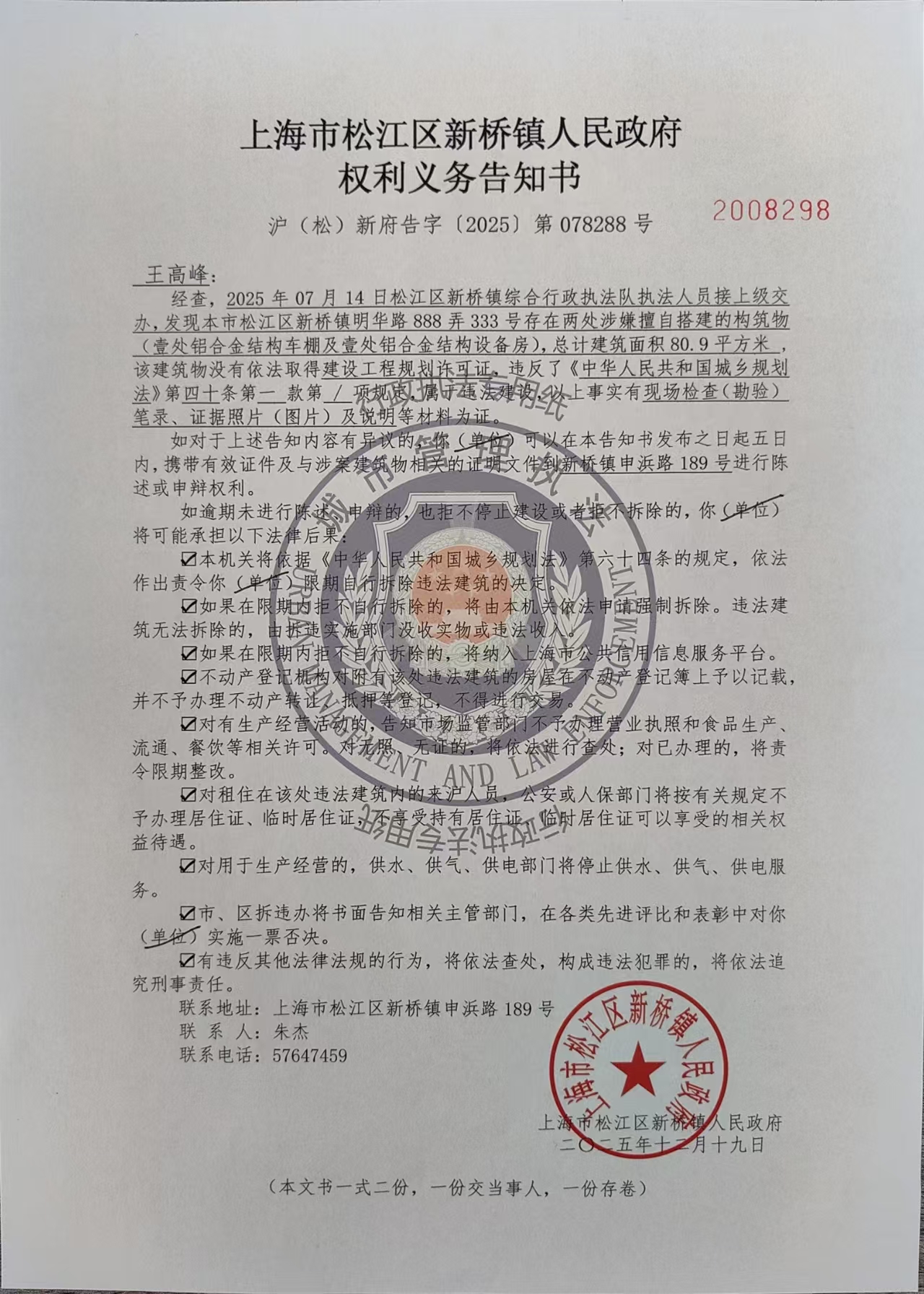 附:《权利义务告知书》(沪(松)新府告字〔2025〕第078288号)。