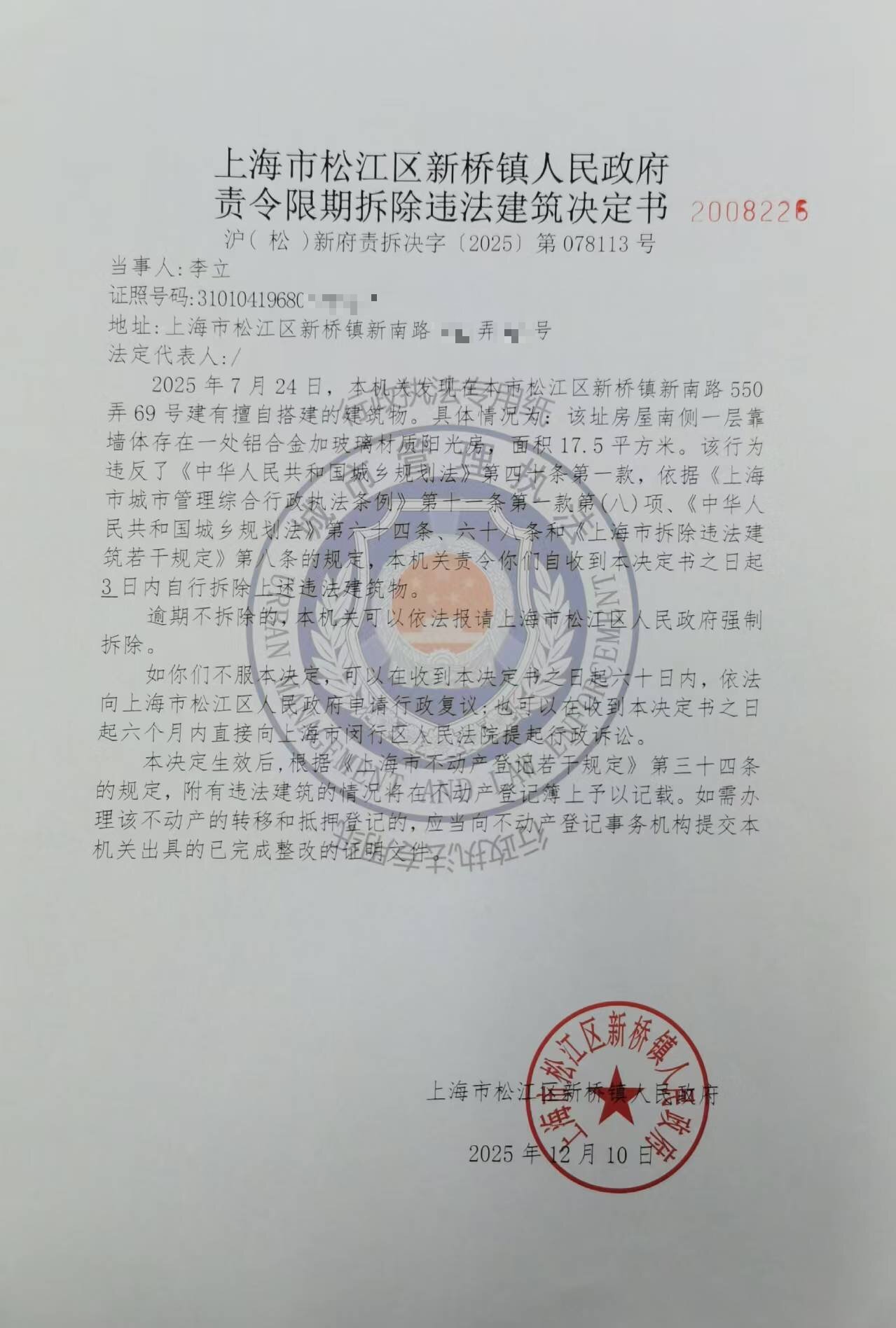 附:《责令限期拆除违法建筑决定书》沪(松)新府责拆决字〔2025〕第078113号