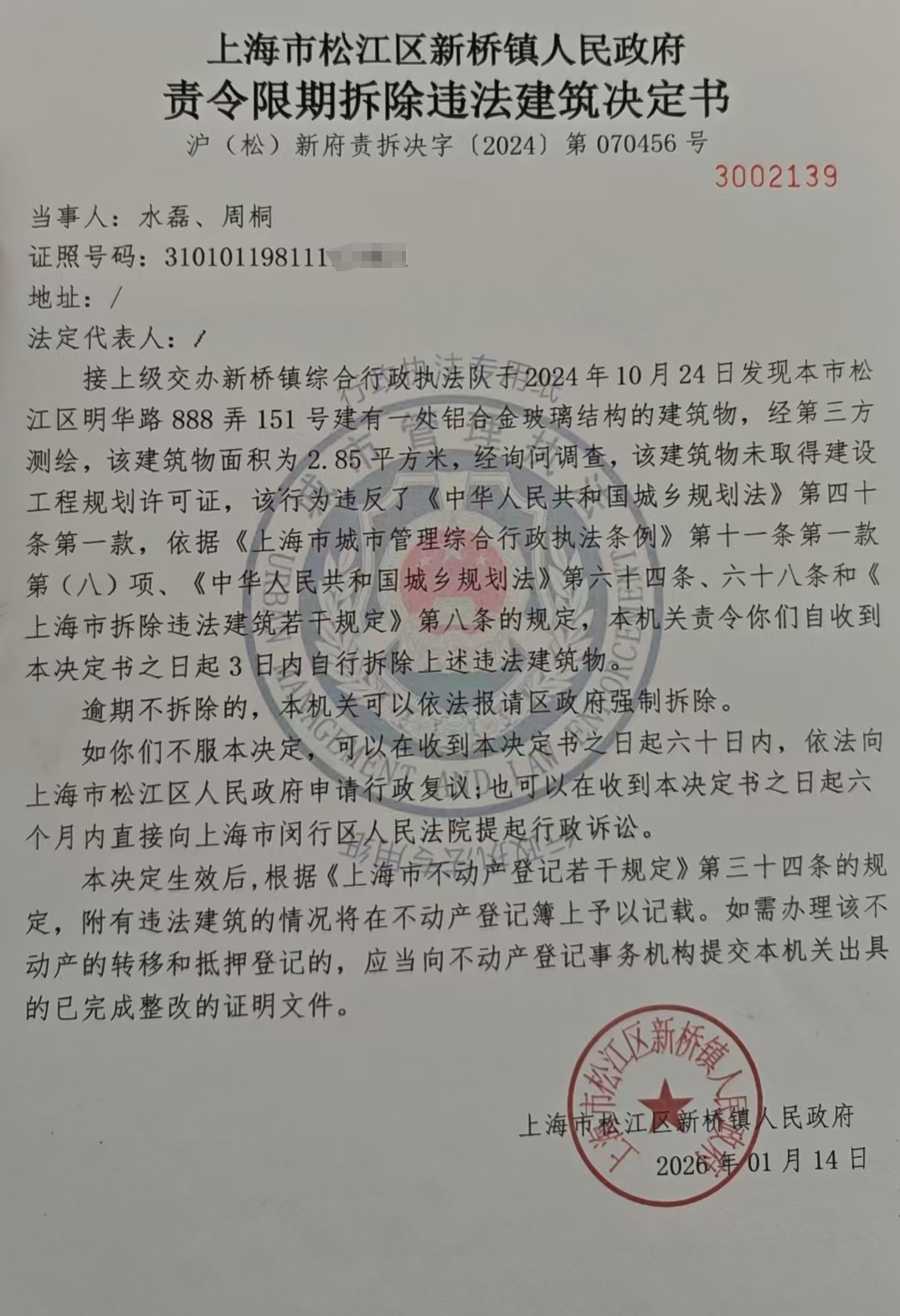 附:《责令限期拆除违法建筑决定书》(沪(松)新府责拆决字[2024]第070456号)