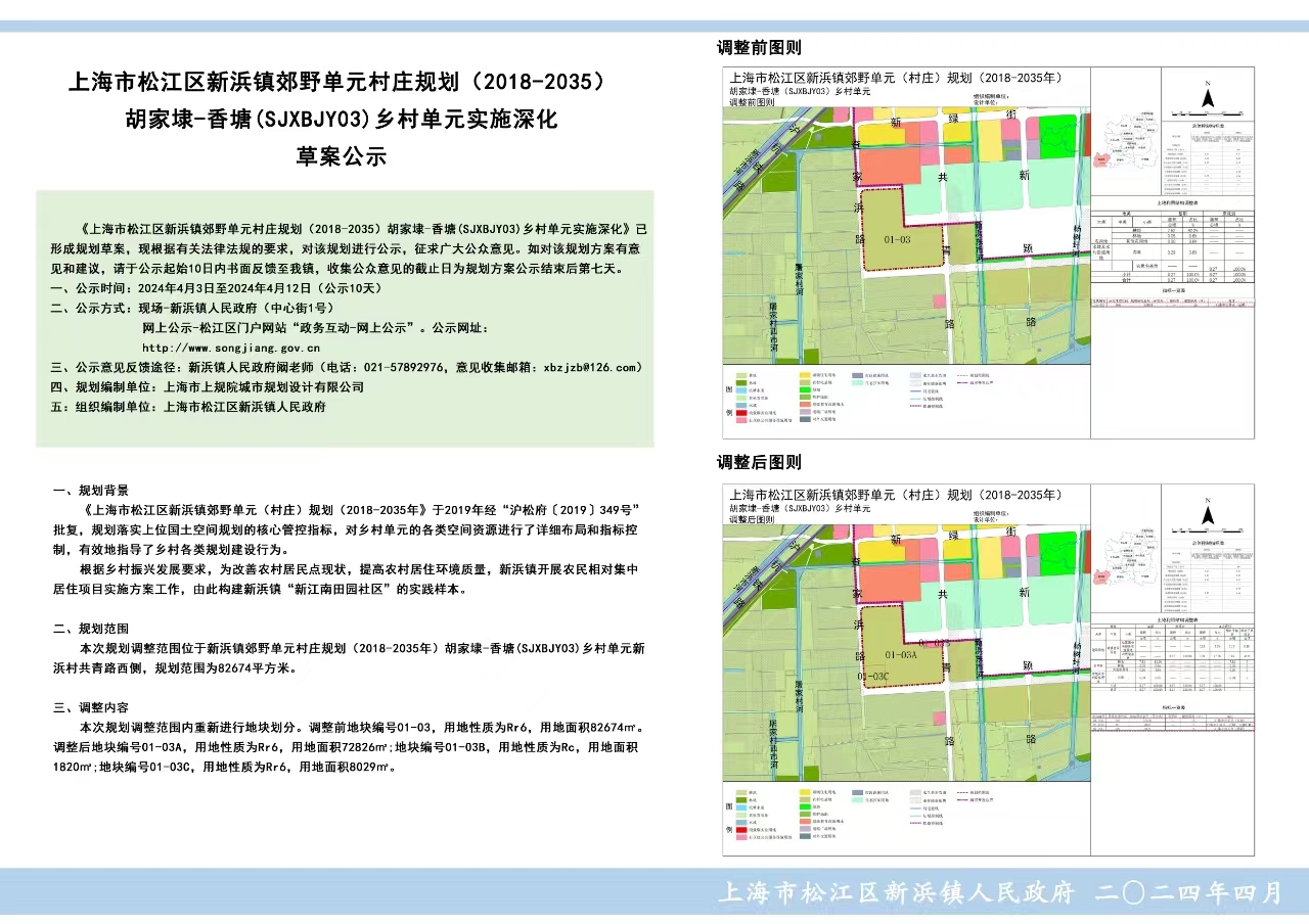 上海市松江区新浜镇郊野单元村庄规划(2018-2035)胡家埭-香塘(SJXBJY03)乡村单元实施深化草案公示