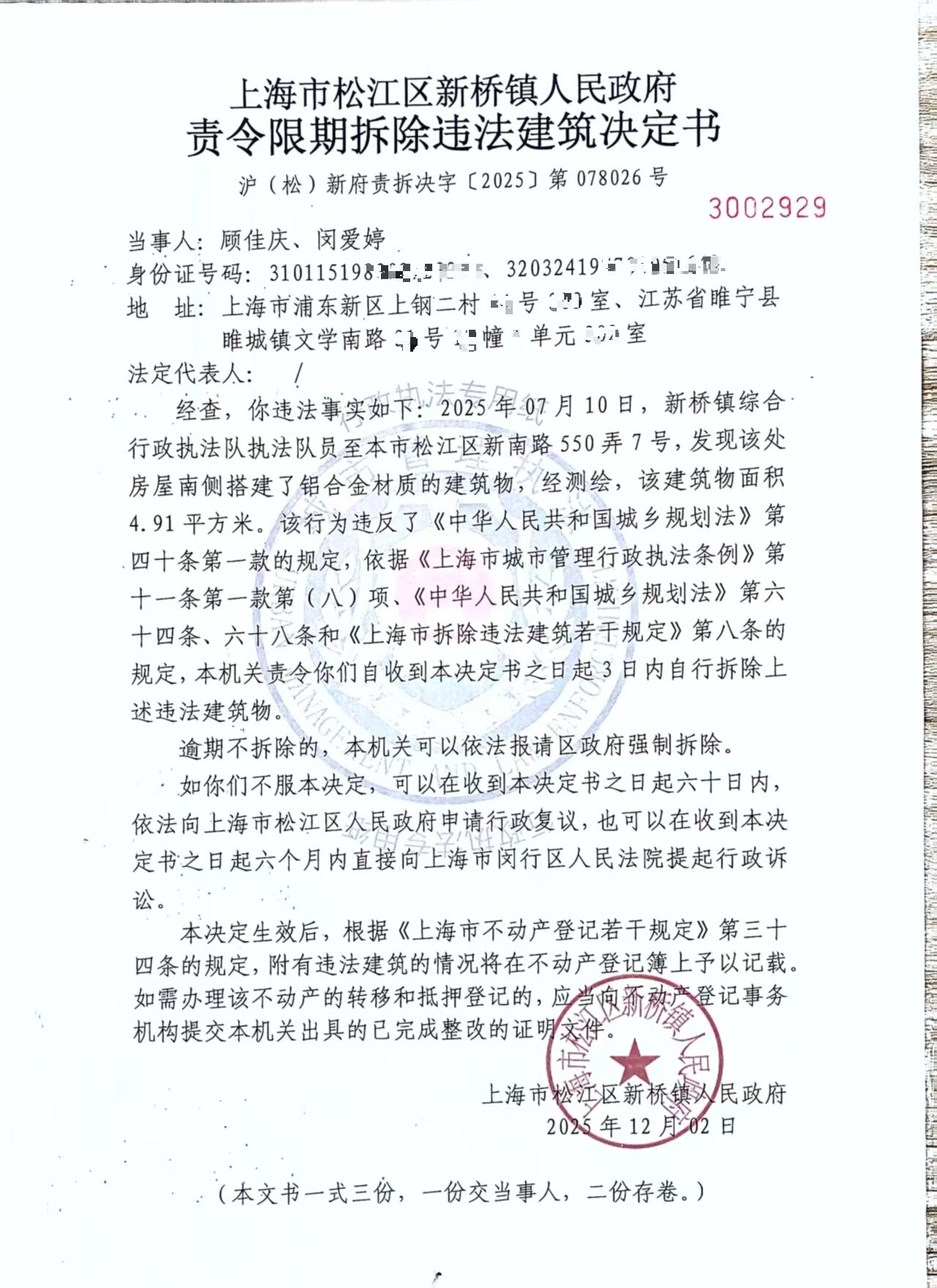 附:《责令限期拆除违法建筑决定书》(沪(松)新府责拆决字〔2025〕第078026号)