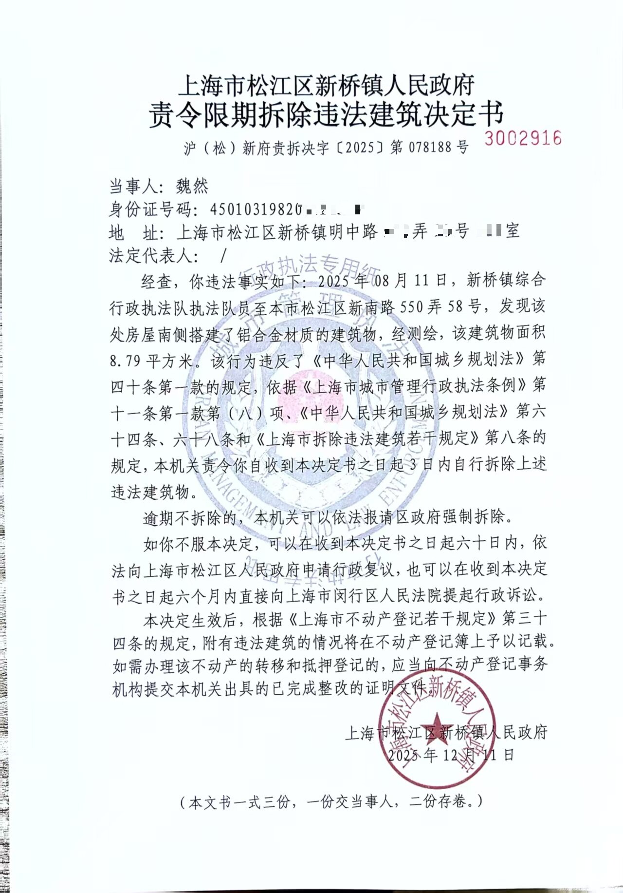 附:《责令限期拆除违法建筑决定书》(沪(松)新府责拆决字〔2025〕第078188号)